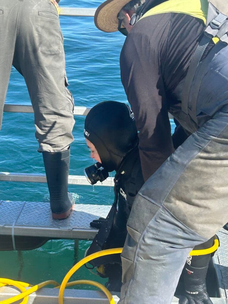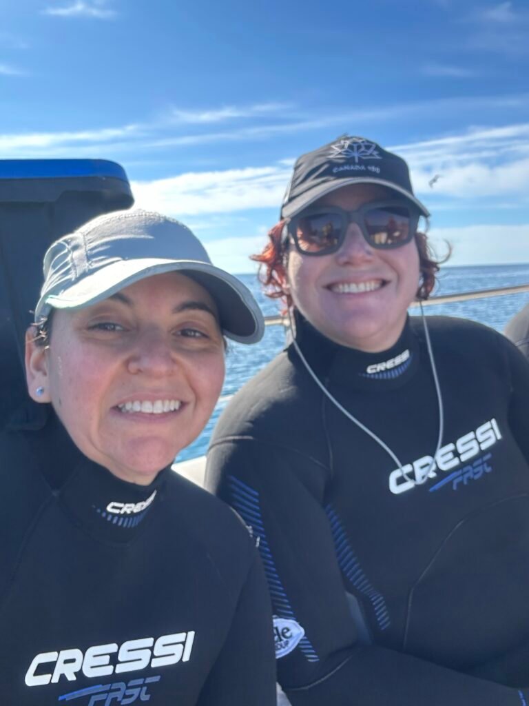 In our layered clothes and layered seasickness precautions, we hauled our heavy wetsuits to the ship. We’d been given cold water suits, boots, gloves and balaclava-type hats. It was a lot!